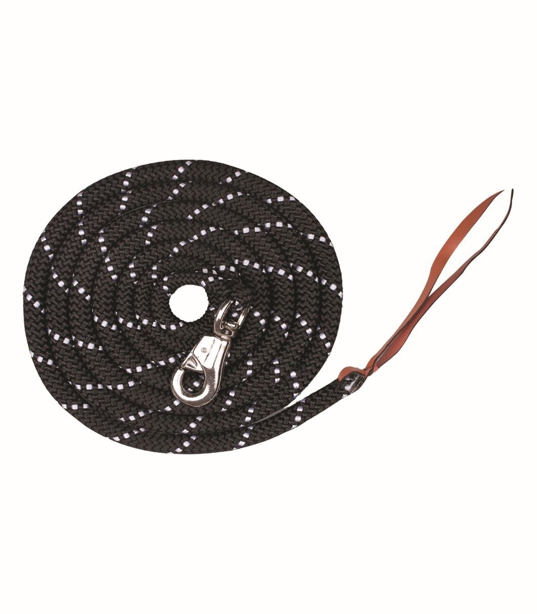Longe éthologique en polypropylène avec mousqueton Bull snap à une extrémité et double lien en cuir à l’autre.